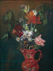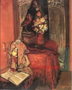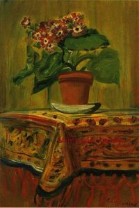 ![]() | Flowers | 46x38 | Oil on canvas | Galerie Di Veroli, Paris, France Private collection, Paris, France | MIN048 | flower vase book basket book interior table red | ||||