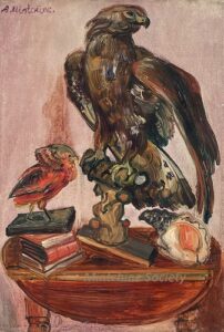 ![]() | Eagle and bird | 55x38 | Oil on canvas | top left | 1989 - "Mintchine", Galleria Lorenzelli, Bergame, Italy, illustrated N°236 p.26 and in front cover 1999 - "Abraham Mintchine" retrospective Mané Katz Museum, Haifa, Israel N°44 2000 - "Abraham Mintchine" retrospective Musée du Montparnasse, Paris, France 2009 - "Abraham Mintchine" retrospective, Musée du Donjon, Niort, France, N°40 illustrated 2015 - "Mintchine - Oeuvres Choisies", Galerie Di Veroli, Paris, France | Paolo Di Domenico, Rome, Italy Galerie Di Veroli, Paris, France | MIN054 | stuffed bird eagle book shellfish table still life interior | ||