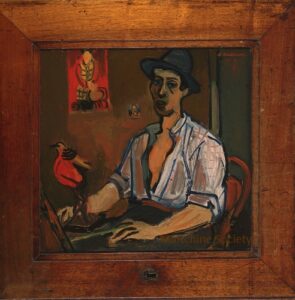 ![]() | The artist in front of his easel | 54x53 | Oil on wood cupboard door | top right | 1981 - "Mintchine", Galleria Compagnia Del Disegno, Milan, Italy 1986 - "Mintchine", Régine's Gallery, Rome, Italy 1999 - "Abraham Mintchine", retrospective, Mané Katz Museum, Haifa, Israel, N°41 2000 - "Abraham Mintchine", retrospective Musée du Montparnasse Paris, France | 1981 - Di Veroli and Testori, Abraham Mintchine, illustrated p.16 N° 6, Ed.Giorgio Mondadori | Vittorio Bellini, Bergame, Italy Galerie Di Veroli, Paris, France Private collection, Lyon, France | MIN118 | self portrait man artist easel brush suffed bird painting interior chair door cupboard open unbottoned shirt sleeve rolled up | |