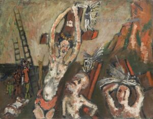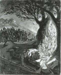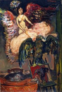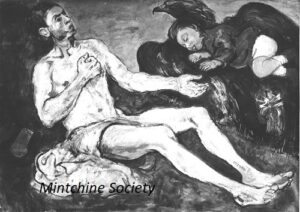 ![]() | The artist and his daughter carried by an eagle (symbol of divine mercy) | 81x116 | Oil on canvas | bottom left | 1999 - "Abraham Mintchine" retrospective Mané Katz Museum Haifa, Israel, N°16 | 1981 - Di Veroli and Testori, Abraham Mintchine, illustrated p.115 N°177, Ed.Giorgio Mondadori | Ein Harrod Museum, Ein Harrod, Israel | MIN252 | Allegory man nude artist self-portrait girl daughter Irene Mintchine eagle cloth | |