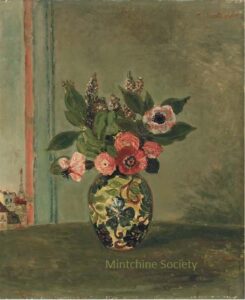 ![]() | Vase of flowers | 55x46 | Oil on canvas | top right | 1960 - "Mintchine", Mc Roberts and Tunnard Gallery, London, UK, N°12, illustrated | 1981 - Di Veroli and Testori, Abraham Mintchine, illustrated p.32 N°33, Ed.Giorgio Mondadori | Mc Roberts and Tunnard Gallery, London, UK Private collection, Israel Galerie Di Veroli, Paris, France Michel Lièvre, Paris, France Private collection, Ukraine | MIN125 | Decorated vase flower lupine poppy anemone table sill life interior Paris building Tour Eiffel | |