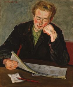 ![]() | Man with the newspaper | 73x60 | Oil on canvas | top left | 1981 - Di Veroli and Testori, Abraham Mintchine, illustrated p.111 N°172, Ed.Giorgio Mondadori | Galleria Lorenzelli, Bergame, Italy Galerie Di Veroli, Paris, France Private collection, Israel | MIN145 | Portrait man sitting concentrating fist hand on cheek reading newspaper pen paper table jacket shirt | ||