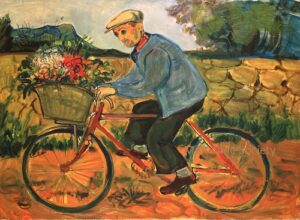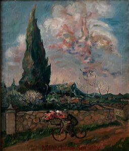 ![]() | The cyclist | 73x100 | Oil on canvas | bottom left | 1989 - "Mintchine", Galleria Lorenzelli, Bergame, Italy, illustrated board II p.21 1998 - "Mintchine", Galerie Di Veroli, Paris, France 1999 - "Abraham Mintchine" retrospective, Mané Katz Museum, Haifa, Israel, N°49 2000 - "Abraham Mintchine" retrospective, Musée du Montparnasse, Paris, France | 2010 - Vita Susak, Ukrainian Artists in Paris, 1900-1939, illustrated p.314 N°128, Ed.Rodovid | Paolo Di Domenico, Rome, Italy Galerie Di Veroli, Paris, France Private collection, Israel | MIN196 | bicycle cyclist cycle basket lower pedaling jacket beret countryside road stone wall tree hill | |