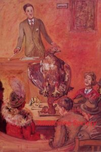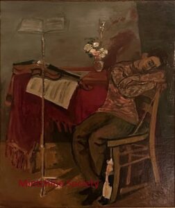 ![]() | The auctioneer | 65x50 | Oil on canvas | top right | 1989 - Di Veroli, Lorenzelli and Veca; Abraham Mintchine, illustrated p.37 N°25 | Private collection | MIN325 | portrait auctioneer mustache jacket shirt tie auction hammer painting framed curtain stuffed bird | ||