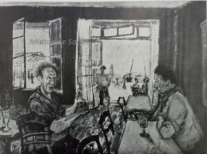 ![]() | The Drinker | 100x65 | Oil on canvas | top left | 1969 - "Mintchine", Galleria lorenzelli, Bergamo, N°7 illustrated 1970 - "Mintchine", Galleria San Fedele, Milan, N°6 illustrated 1973 - "Mintchine", Galleria La Parisina,Turin, Italy 1981 - "Mintchine", Galleria Compagnia Del Disegno, Milan, Italy 1989 - "Mintchine", Galleria lorenzelli, Bergame, Italy 2009 - "Abraham Mintchine" retrospective, Musée du Donjon, Niort, France, illustrated p. 22 N°5 and front cover 2012 - "Mintchine-Portraits", Galerie Di Veroli, Paris, France 2015 - "Mintchine-Oeuvres Choisies", Galerie Di Veroli, Paris, France | 1929 - Nino Franck, L'Art Vivant N° 109, illustrated p. 539 1981 - Di Veroli and Testori, Abraham Mintchine, illustrated p.159, N°228 and also back cover, Ed.Giorgio Mondadori 1981 - Catalogo dell'Arte moderna italiana Bolaffi, N°17 Pag 497, illustrated | Galerie Alice Manteau, Paris, France Galleria Lorenzelli, Bergame, Italy Galerie Di Veroli, Paris, France | MIN010 | drinker drinking smoker smoking chair frenchman interior table mirror sitting astride wine alcohol wicker sidechair | |