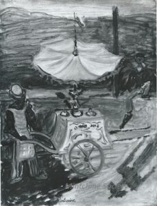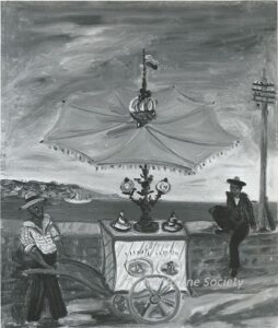 ![]() | The ice cream seller | 65x50 | Oil on canvas | bottom centre | 1981 - Di Veroli and Testori, Abraham Mintchine, illustrated p.95 N°157, Ed.Giorgio Mondadori | Bineth, Tel-Aviv, Israel | MIN326 | scene ice cream seller cart parasol sea road man relaxing wall sea summer | ||