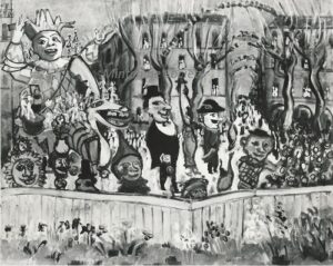 ![]() | Child and harlequin | 92x65 | Oil on canvas | bottom left | 1981 - Di Veroli and Testori, Abraham Mintchine, illustrated p.74 N°122, Ed.Giorgio Mondadori | Private collection, Israel | MIN255 | chid beret coat scard harlequin white socks wall fence house | ||