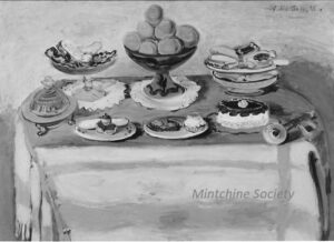 ![]() | Still life with bread, artichokes and apples | 65x100 | Oil on canvas | top left | 1960 - "Mintchine", Mc Roberts and Tunnard Gallery, London, UK, N°8, illustrated | 1981 - Di Veroli and Testori, Abraham Mintchine, illustrated p.41 N°51, Ed.Giorgio Mondadori | Mc Roberts and Tunnard Gallery, London, UK Private collection | MIN276 | still life artichoke bread apple basket doily place mat table | |