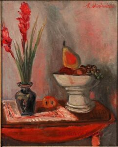 ![]() | Flowers in a red jug | 61x46 | Oil on canvas | top left | dated 29 (1929) | 1969 - "Mintchine", Galleria Lorenzelli, Bergame, Italy, illustrated N°5 1970 - "Mintchine", Galleria San Fedele, Milan, Italy, illustrated N°8 1981 - "Mintchine", Galleria Compagnia Del Disegno, Milan, Italy 1986 - "Mintchine", Régine's Gallery, Rome, Italy 1998 - "Mintchine", Galerie Di Veroli, Paris, France 1999 - "Abraham Mintchine" retrospective Mané Katz Museum, Haifa, Israel, illustrated N°28 2000 - "Abraham Mintchine" retrospective Musée du Montparnasse, Paris, France, illustrated 2009 - "Abraham Mintchine"retrospective, Musée du Donjon, Niort, France illustrated N°37 2015 - "Mintchine - Oeuvres Choisies", Galerie Di Veroli, Paris, France | 1981 - Di Veroli and Testori, Abraham Mintchine, illustrated p.98 N°160, Ed.Giorgio Mondadori 1986 - Paolo Levi, Arte, Mensile di arte cultura e informazione N°164, Il Mistero di Abraham Mintchine, il genio dimenticato, illustrated p.51 2004 - Dimitry Levenson, Our Heritage, monthly art magazine N°69, Moscow, (journal in Russian), illustrated p.143 | Galleria Lorenzelli, Bergame, Italy Galerie Di Veroli, Paris, France | MIN040 | vase red flower stil life |