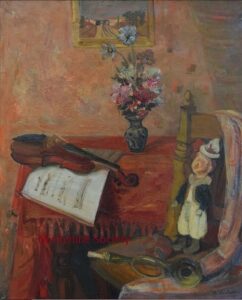 ![]() | Interior with music instruments, flowers and doll | 65x54 | Oil on canvas | bottom right | Private collection, Israel Malab'Art Gallery, London, UK | MIN422 | interior music score sheet instrument trumpet violin chair puppet table tablecloth vase flowers railway painting | |||