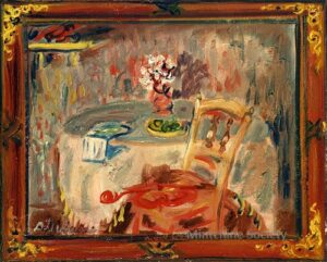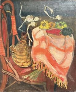 ![]() | Still life with peppers and garlic | 55x46 | Oil on canvas | bottom left | Private collection, Paris, France | MIN506 | still life chair table pink tablecloth garlic pepper | |||