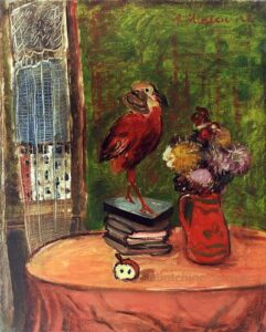![]() | Still life | 46X38 | Oil on canvas | Top right | 2005 - Di Veroli, Abraham Mintchine, illustrated p.60 N°72 Ed.Galerie Di Veroli | Private collection, Lyon, France | MIN482 | still life interior stuffed bird book books vase flower flowers table red tablecloth apple wallpaper windows curtains view building |
